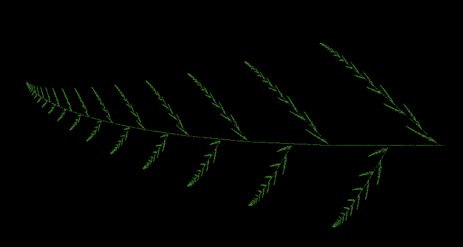 L’image est entièrement générée à partir d’équations mathématiques choisies par Barnsley, et elle ressemble de manière frappante à une vraie fougère.